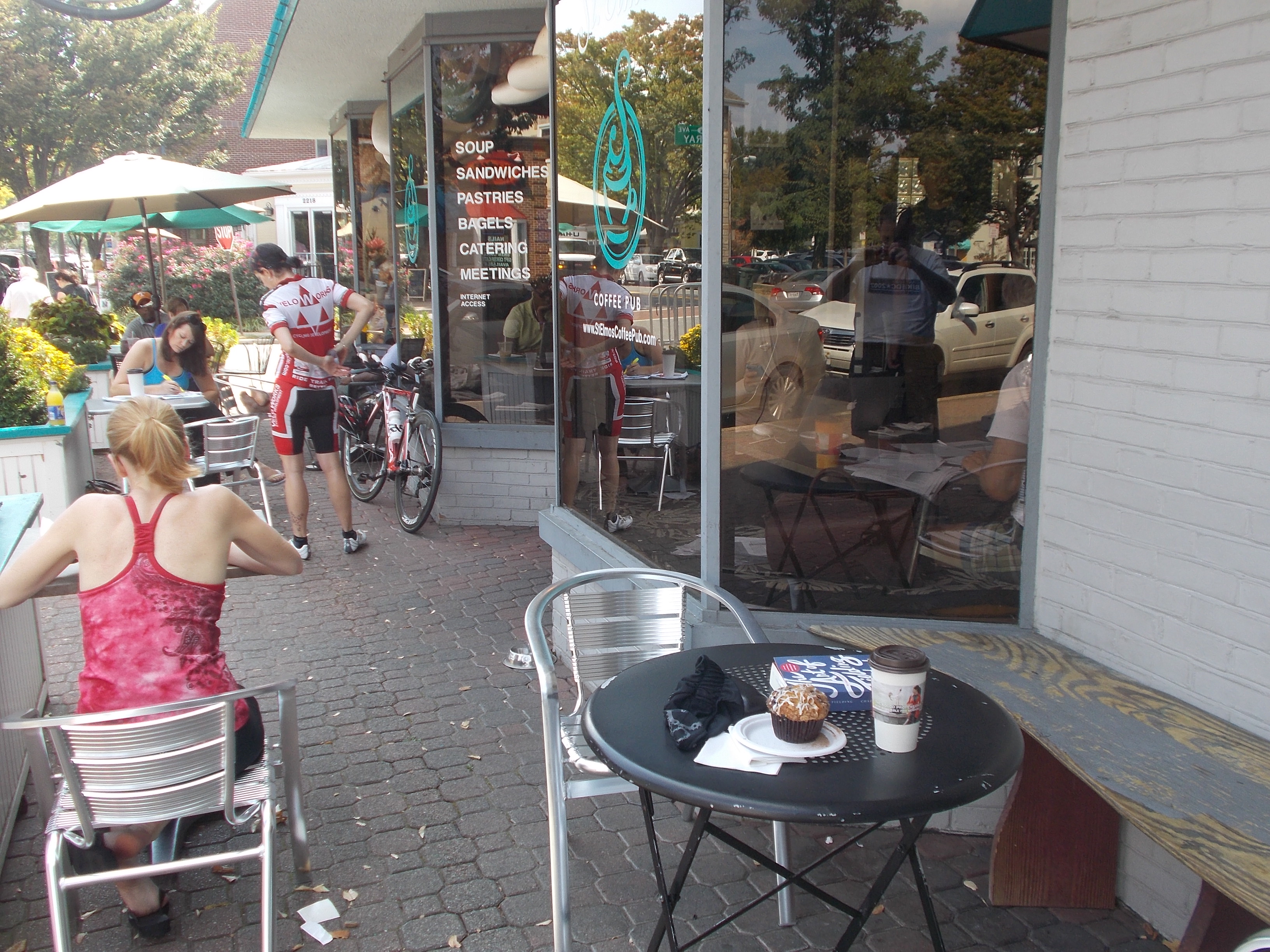 As I was getting ready to leave the car, the guy in the car next to me says, “Are you Rootchopper?” It turns out he is known online as Consularrider and he works in the building next to me in Rosslyn. Small world. After a brief chat, I took off to pick up my t-shirt and cue sheet. I decided to ride the 43 mile ride instead of the 71 miler. After doing the check in, I headed out for a brief tour of Warrenton. Old Town Warrenton is quaint and small, but I managed to get lost anyway. After about 3 miles or riding I pulled into Red Truck Bakery. I had a coffee and an orange cranberry walnut muffin. The coffee was okay but the muffin was mouthwatering. Readers of the blog may find this familiar since I had the very same thing last year. It is still the best damned muffin in the universe.