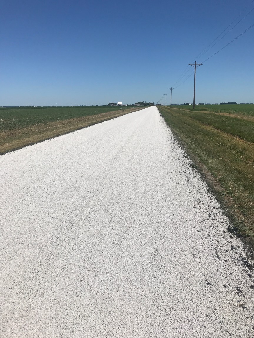 Many of the county roads are paved with chip seal. The road is coated with sticky tar and then gravel is put in top. I road a few miles on roads that had been recently renewed. It slowed me down but didn’t approach the level of unpleasantness that other bike tourists had warned me about.