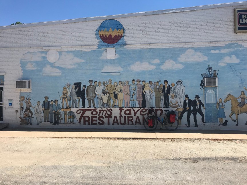 And there is a small bird that looks to me like a sandpiper. It’s about the size of a cardinal. It gray-ish feathers on its wings and tail with a brown patch just above the tail. They only fly a few feet off the ground. After flying for 30 yards they land and run for a few feet before taking off again. They are entertaining to watch and I must have seen 100 of them today.I road past several wind farms today. It’s amazing what happens when you plant a turbine seed in a corn field. I once saw a turbine blade on display near the Energy Department. The thing looked to be as long as a football field. (How they drove into DC with it is beyond me.) Anyway, seeing these things from a distance is truly impressive but up close they are hypnotic. I nearly ran off the road I was so captivated by them.Another thing I noticed today is that the pool table is starting to have some gentle up slopes. I probably climbed 200 or 300 feet today, 30 feet here, 20 feet there. In Kempton I stopped for lunch at Tom’s. There is a mural that runs the length of the building. It’s a bit like to cover of Sgt. Pepper’s. I parked The Mule to the left of Dorothy from the Wizard of Oz. Is she signing something?In Odell I crossed Route 66. There is now a bicycle route that follows the route from Chicago to Los Angeles. As I was taking a picture of the sign a woman jumped out of her car to get a picture of her own. My plan had me stopping at Cornell Illinois but there were no campgrounds or hotels there. There was plenty of daylight left and I was feeling fine after 67 miles so I continued on to the City of Wenona. They let bike tourists camp in the city park. It’s a very nice set up and the shower was the best. My thanks to the Wenona police officer who directed me to the park (and checked up on me later) and to Sheila who showed me around and gave me the secret code to the shower room.On days like this I have a hard time getting off the bike. I rode 92 miles. My total for the first two weeks of the tour is 1,030 miles.