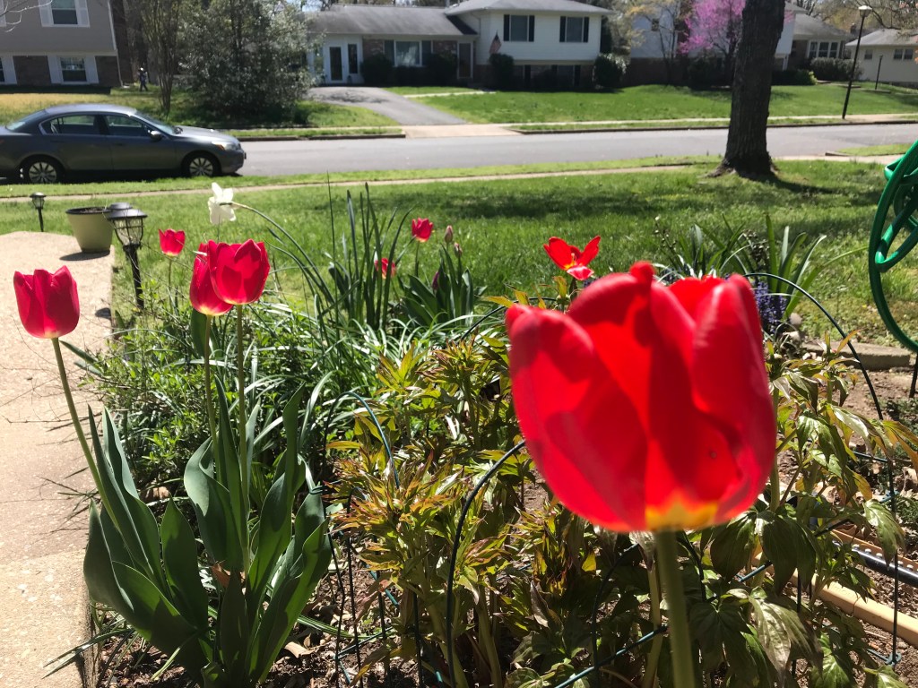 In a few minutes I had changed out of my scuzzy painting togs and into bicycling gear. After admiring some tulips near my front step, I rolled on down the street.