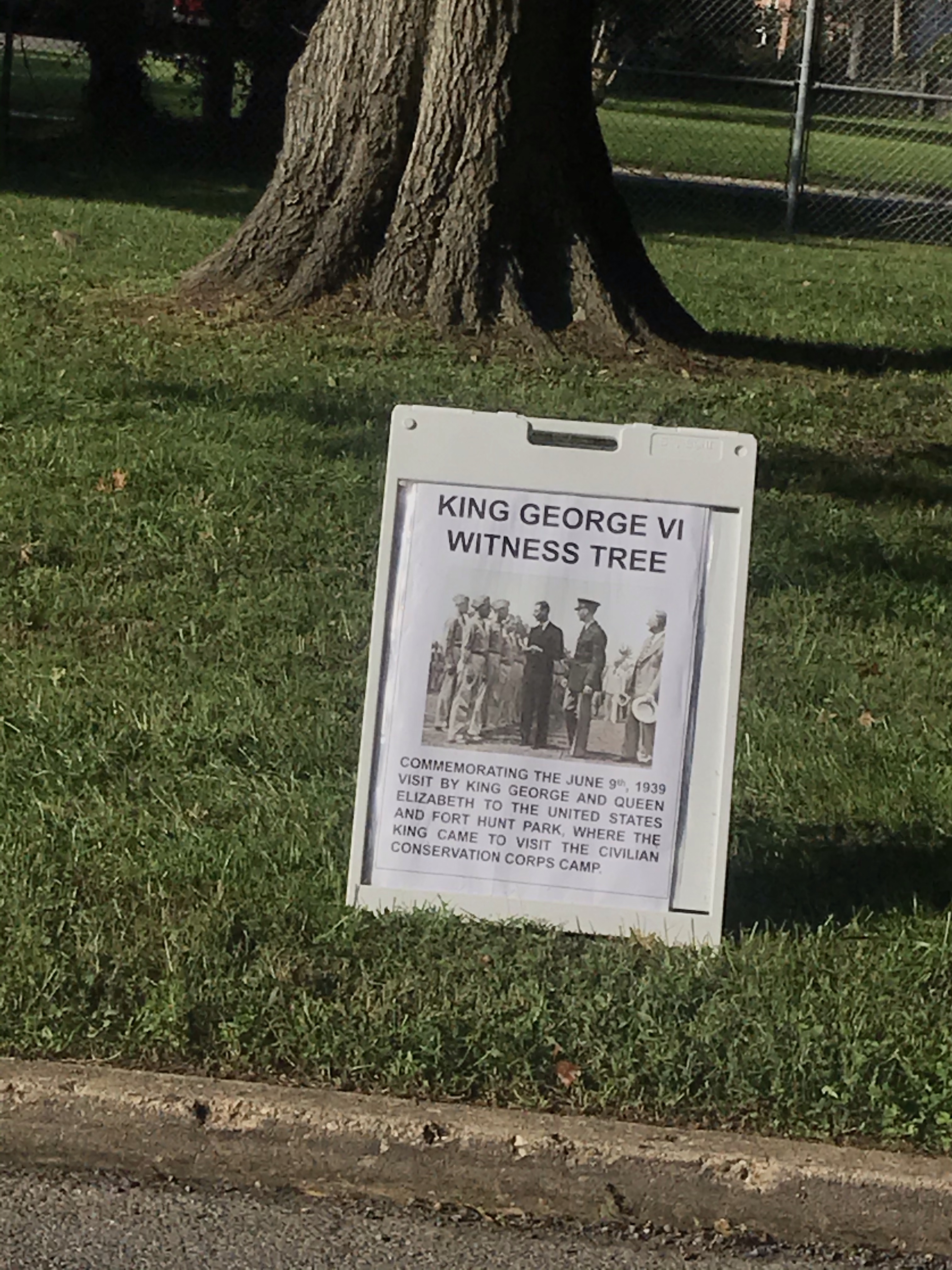 I live near Fort Hunt Park. There is a 1 1/4 mile paved circuit road in the park that I often use when I want to let my brain wander having to worry about fast moving big metal things. The other day I noticed people stopping to read this sign. It explains that in 1939, just before all hell broke loose in Europe, King George VI came to check out the Civilian Conservation Corps operation in the park. They planted a tree in his honor.