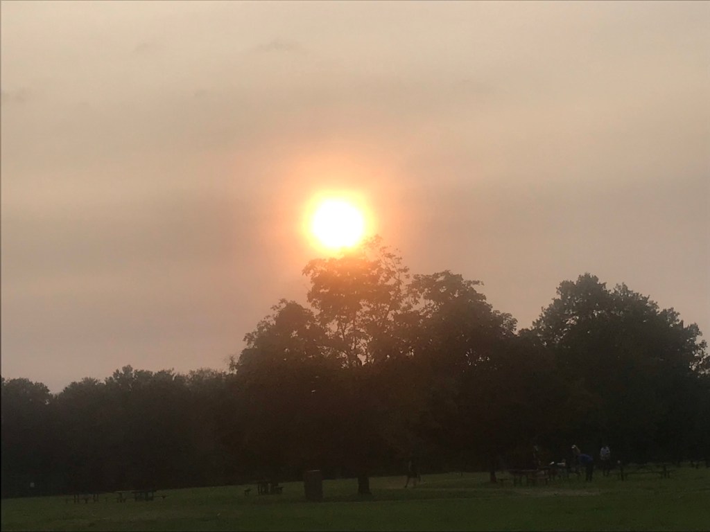 This evening I went to the park to ride around in mindless circles. It was a beautiful evening. Park of the reason the temperature was so agreeable is the fact that a haze is blocking some of the sunlight. The haze is caused by wildfires out west, over 3,000 miles away.