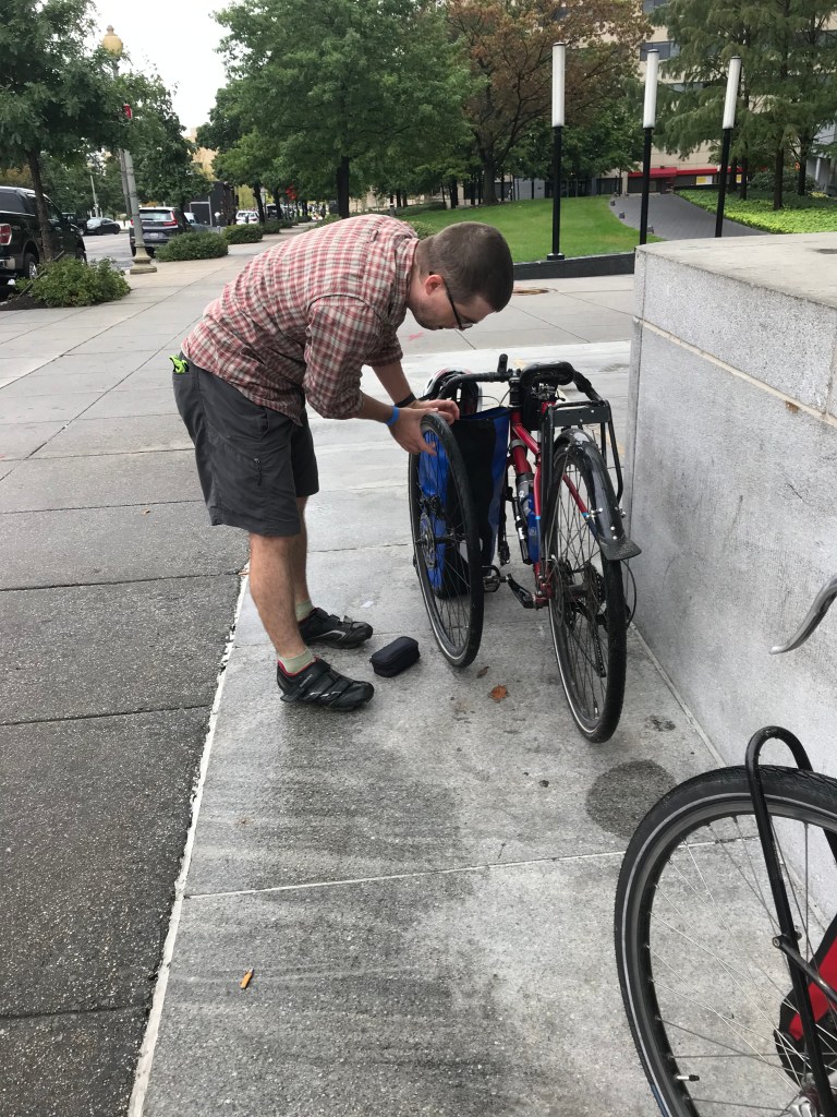 Climbing the hill we turned southeast on Massachusetts Avenue before doubling back toward the Capitol on Maryland. 2nd Street took us behind the Supreme Court and through the Library of Congress buildings. We headed west to Washington before turning south again for Virginia. A security gate caused a brief departure from the route but we were back on track after a couple of blocks. At this point Kevin noticed that his front tire was losing air so we stopped for a repair.