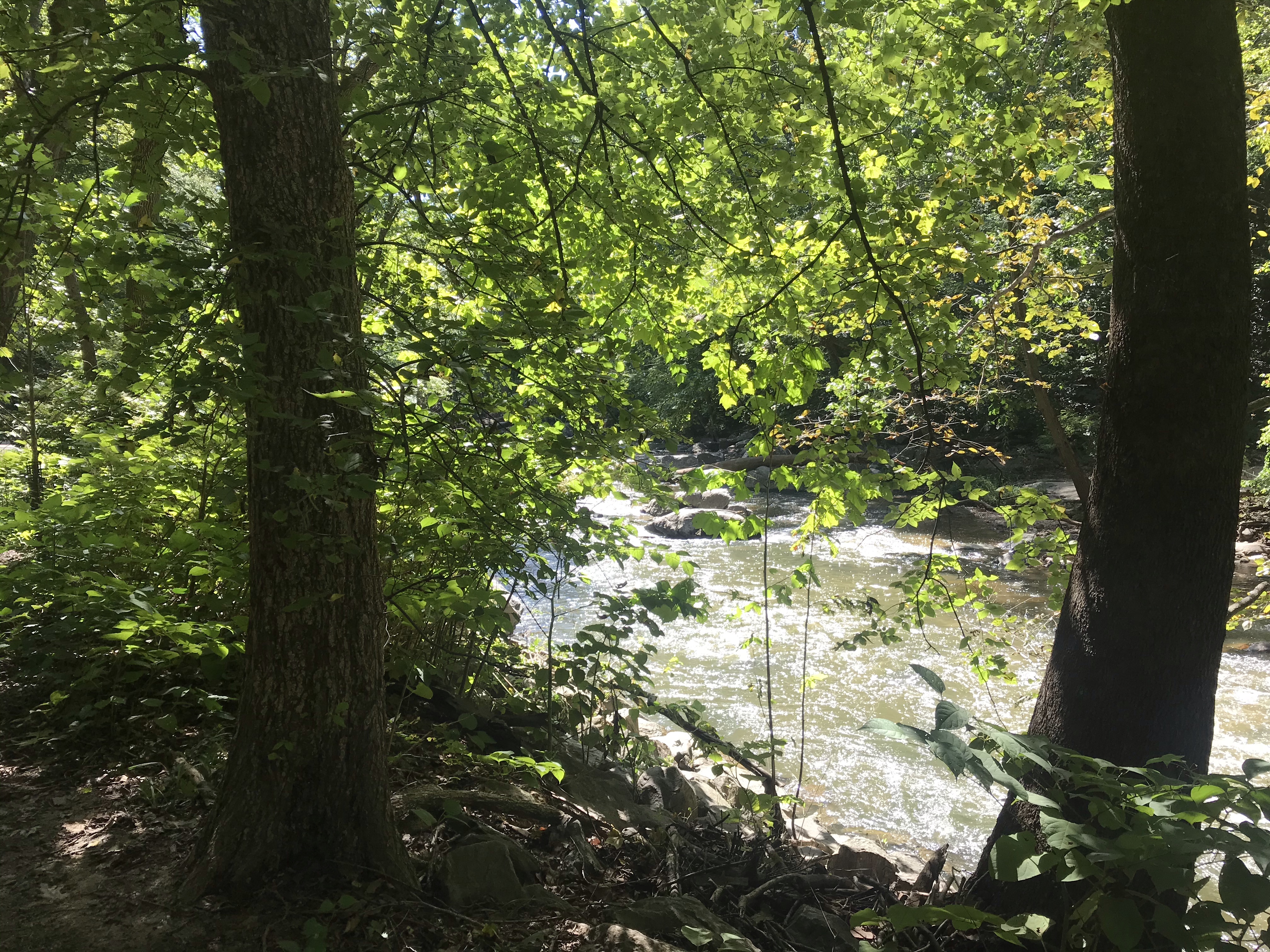 Beach Drive is open to cars and gets a bit hairy nearer to Georgetown. At one point a Maryland driver zoomed passed me honking his horn. I returned digital fire. Then in the interest of self preservation I switched to the side trail. The trail was a mess. Recent rains have caused the creek to overrun its banks. Standing water and mud covered the pavement. I survived.
