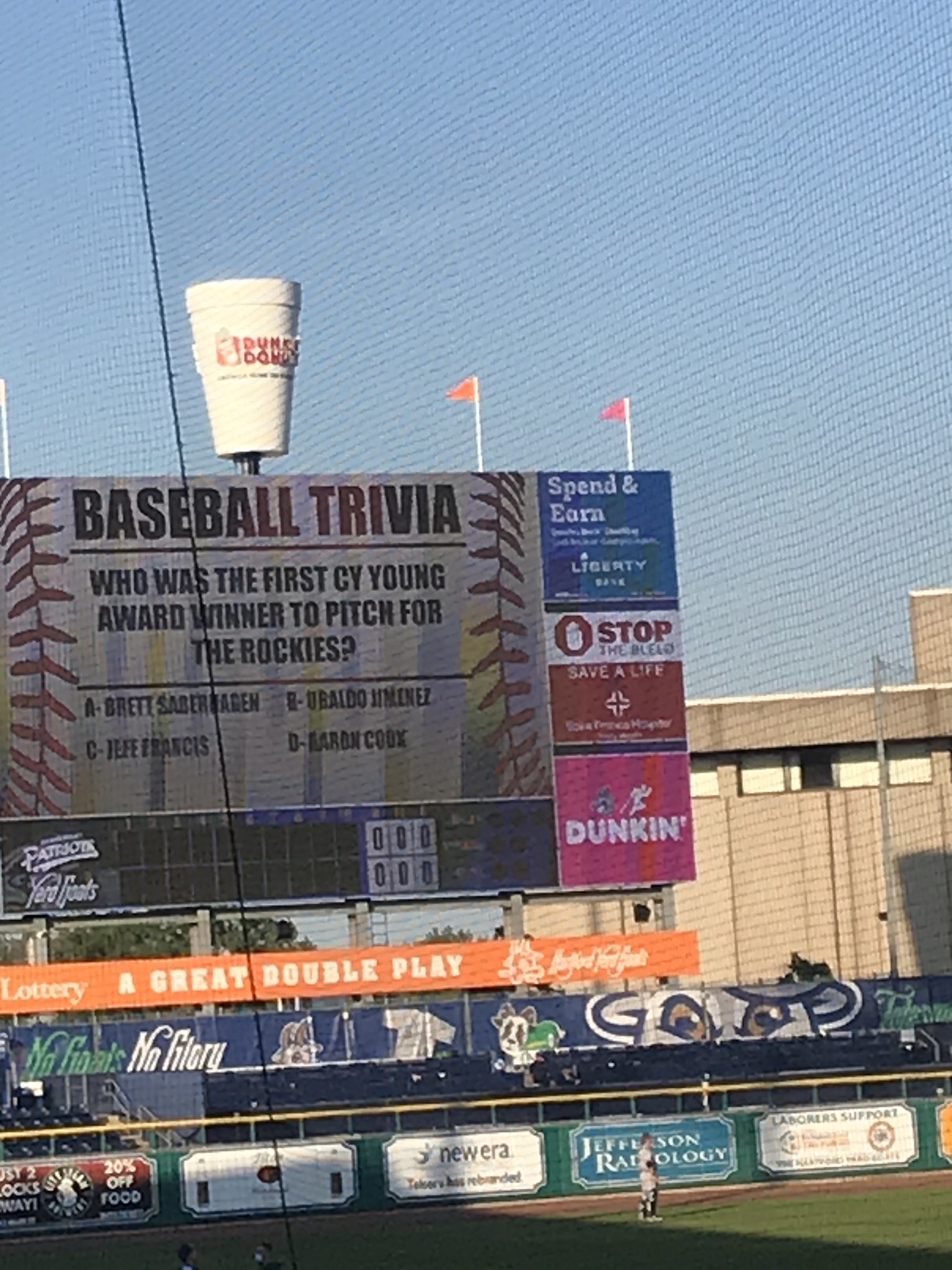 During the spring law school recon trip to Hartford, we attended a AA minor league game. The home team is the Hartford Yard Goats. They play in Dunkin Donuts Park.