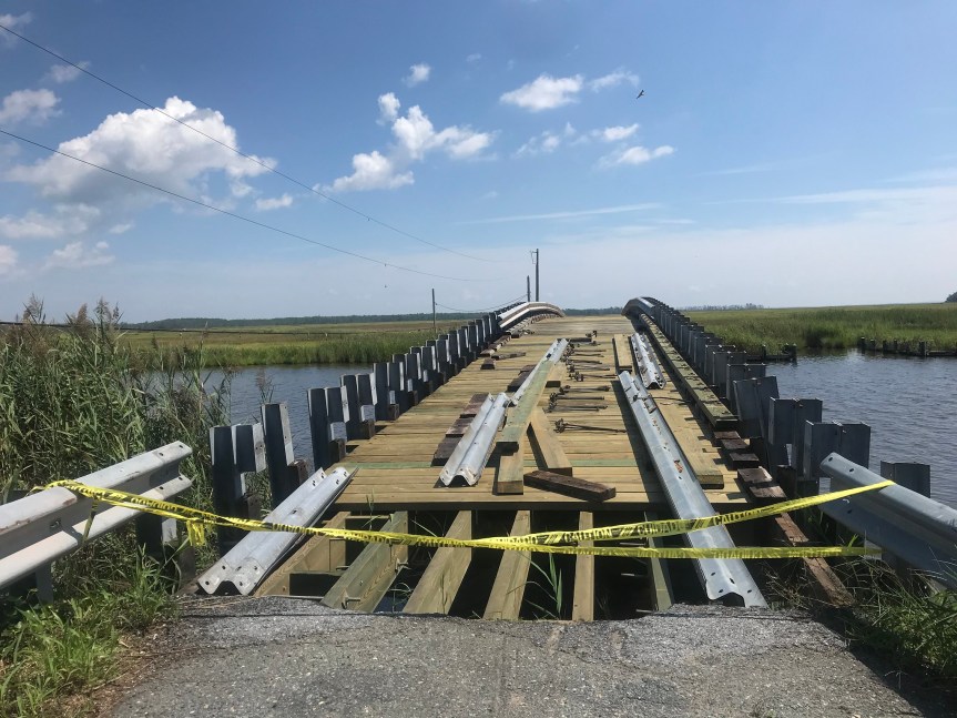 The Eastern Shore of Maryland is a pretty cool place to ride a bike. It’s flat-ish. Traffic is relatively light. And I was sick of riding around home. So I drove over and did rides in Dorchester, Kent, and Cecil Counties. On one ride I kept seeing signs saying “Road Closed” and “Bridge Closed Ahead”. I ignored them, of course. Then I came to a bridge that had been damaged in a flood. I managed to walk across the bridge thanks to some strategically placed guard rails and traffic barriers.