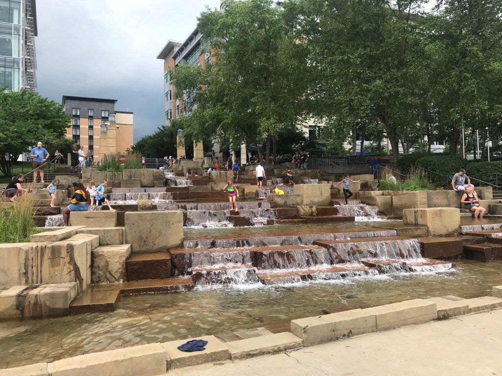 In Pittsburgh I climbed up into the Brighton Heights neighborhood before descending right back down to a paved trail along the Ohio. As the path turned along the Allegheny River it passed a huge Casino and a small water feature.