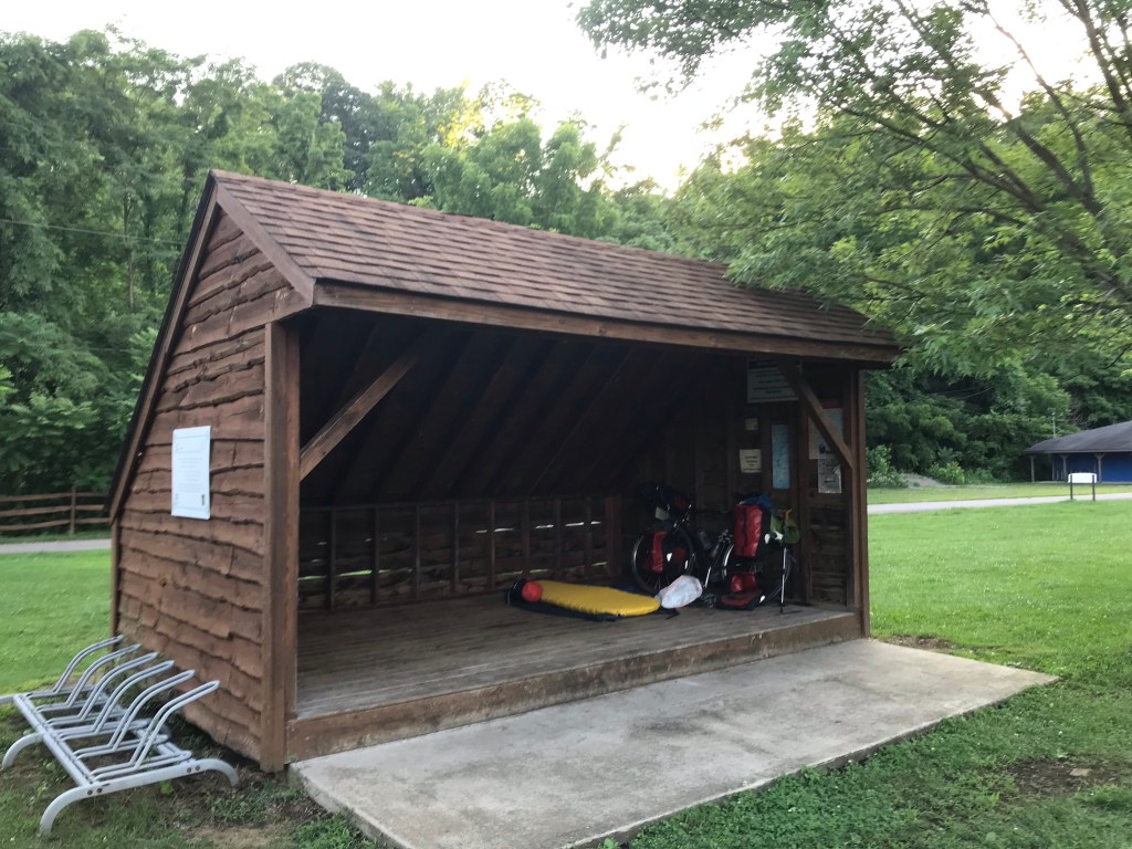 Connelsville had Adirondack shelters to sleep in. About a half mile from camp is a hotel that offer campers a shower for $15 and a hose and rags to clean off your bike. I partook of both and that’s when I learned of my brake problem.