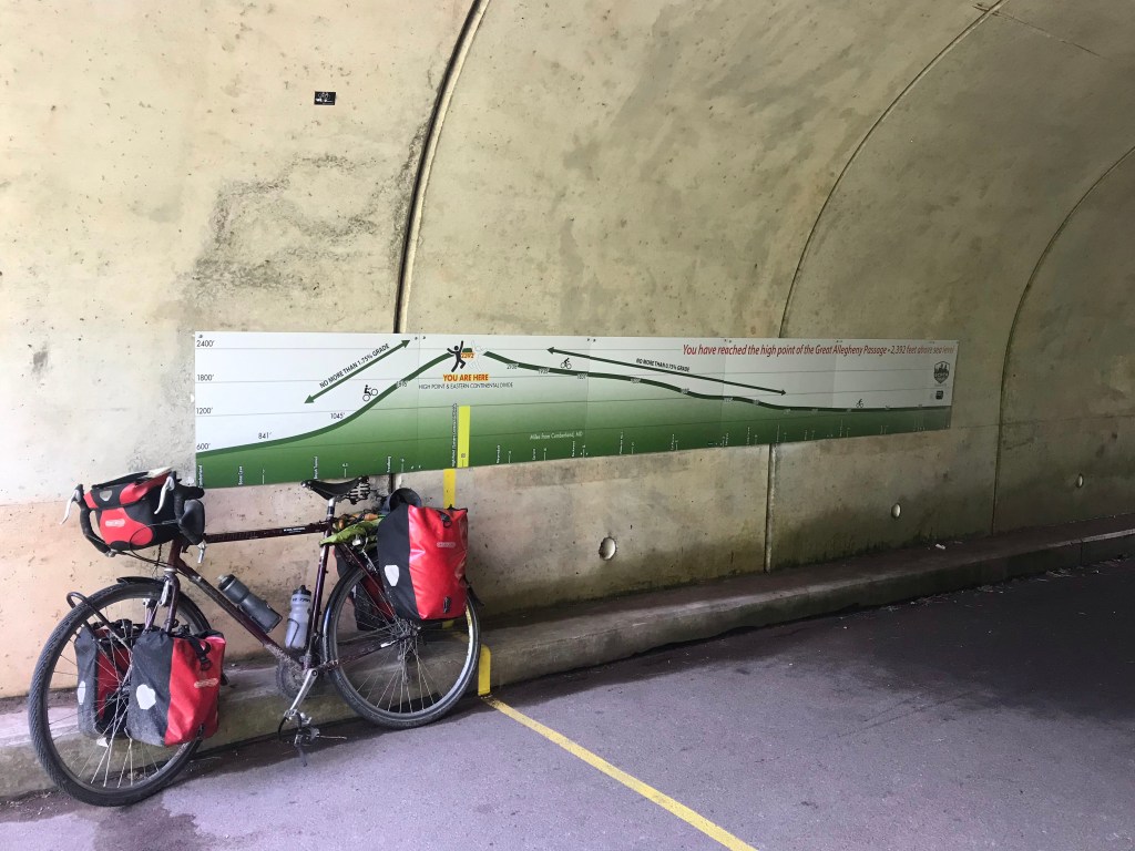 At one point I stopped to adjust something. I had The Mule propped up against a picnic table that had a covering. Instead of cower under cover I put on my rain jacket and made a run for the Pendleton Tunnel. It turned out to be the heaviest rain of the day. Two northbound cyclists sheltering in the tunnel told me that it hadn’t rained on them at all until that moment. This bodes well got the condition of the C&O Canal towpath tomorrow.