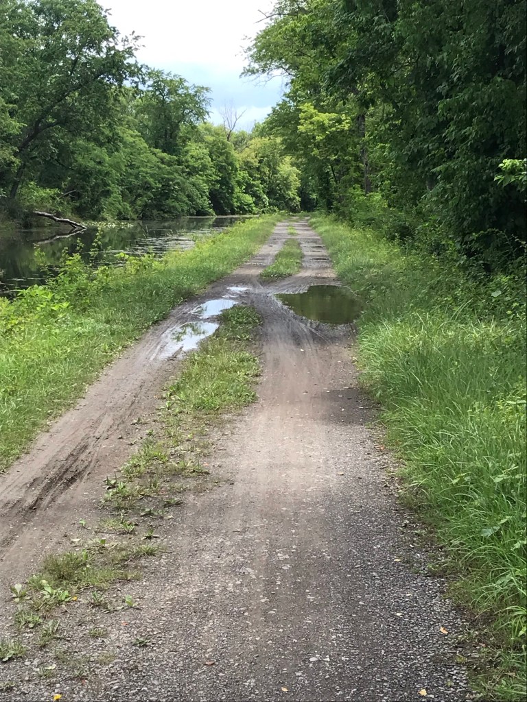 Some puddles had potholes in them. Others had rocks and sticks. I only dismounted once for an especially wide puddle that spanned the path. I swung my right leg over the rear of the bike and planted my right foot only to realize that the edge of the towpath dropped straight into the canal. Luckily I managed to get a toehold and avoid falling backward into the algae-covered water.