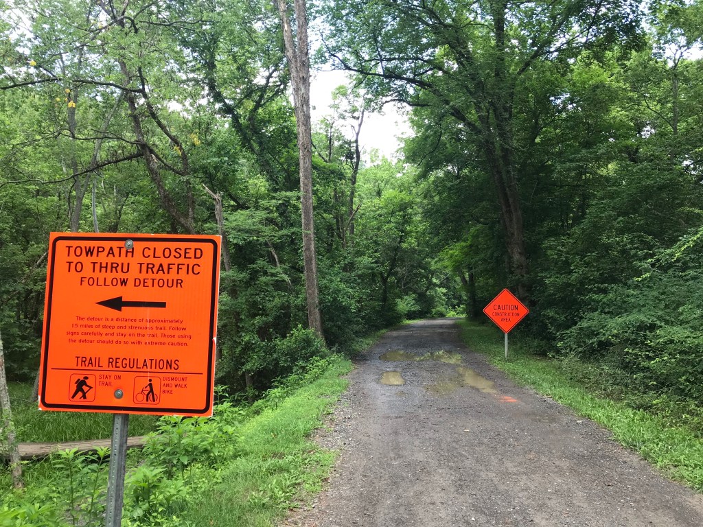 I arrived at the Paw Paw tunnel detour. The tunnel is undergoing repairs so the National Park Service built a 1.5-mile hiking trail for people like me. Imagine going hiking in Shenandoah National Park while pushing 80 pounds of bicycle. The path reminded me of Little Devil Stairs.