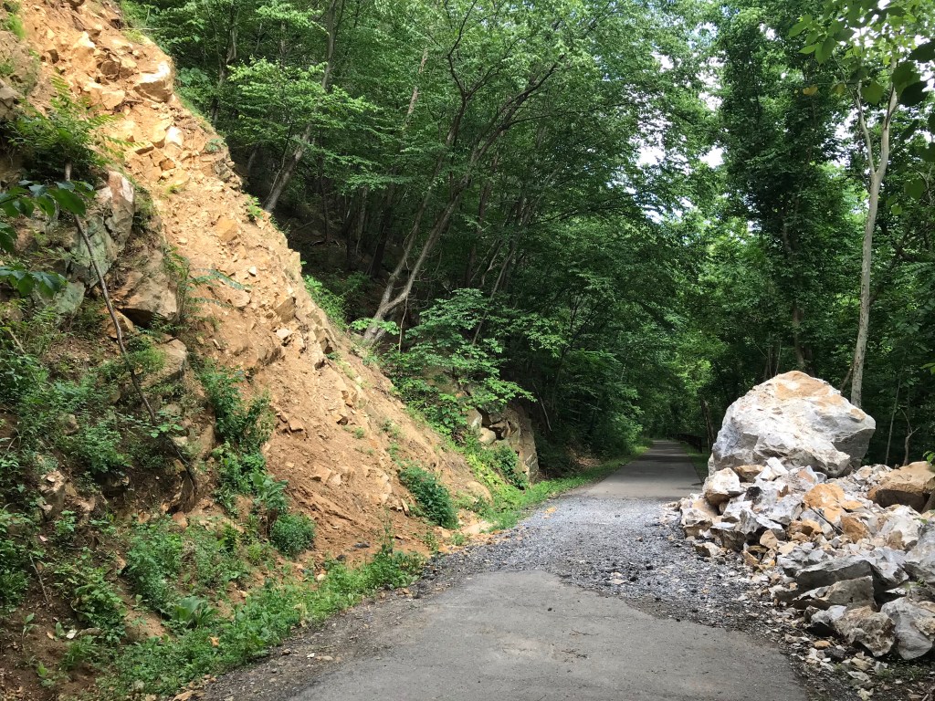 13 miles before Hancock I switched over to a parallel, paved rail trail. Except for dozens of root heaves the paved rail trail was vastly superior to the towpath. Except, that is, for the scary rock slides. One in particular looked lethal. I could see evidence of others from repaired damage to fences that ran along side the trail.