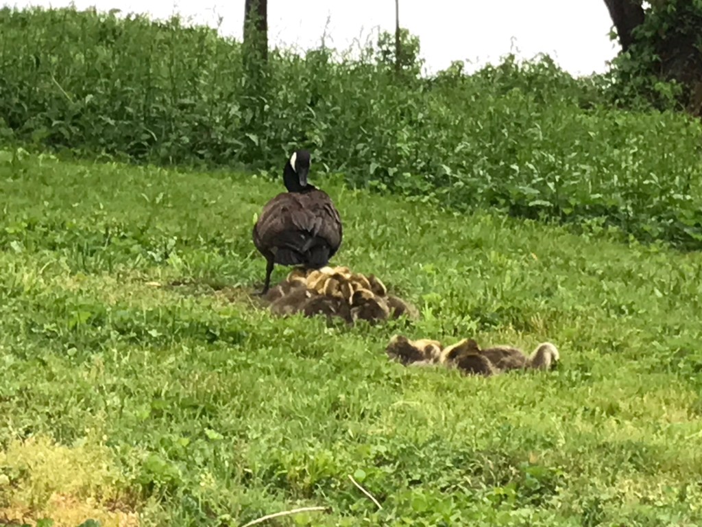 Under the Parkway, through the scenic parking lot we rode. Once in Lady Bird Johnson Park we came upon a cute site: a Canada goose was sheltering a scrum of goslings under its hind feathers. The goslings were all shivering and pecking at one another.