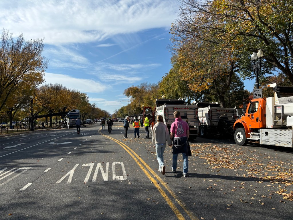 Interview over, I rode the Pennsyvania Avenue cycletrack back to 15th Street through police barricades and onto its cycletrack. There I saw temporary ten-foot-tall fencing running the length of the street and around the corner on Constitution Avenue. Along the curb were dozens of dump trucks and other huge vehicles forming a wall to protect the Ellipse where Kamala Harris was to give a speech in a few hours.