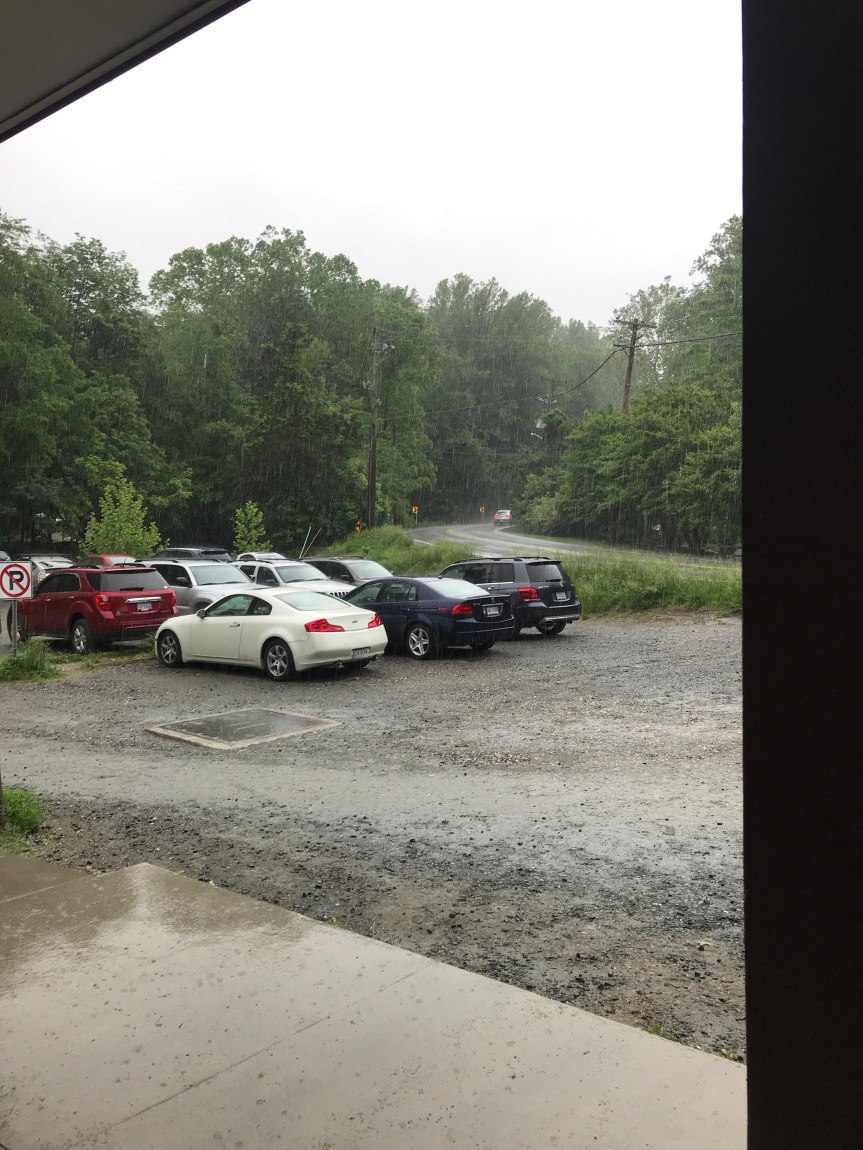 I took a potty break. The restrooms have a covered sidewalk in front. When I came out, The Mule was dry as rain started to fall. Then skies opened up. I pulled out my bag of trail mix and munched a few handfuls. I can wait…..
