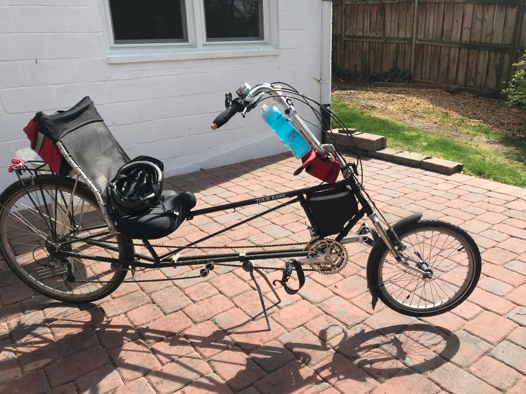 I decided to try one more thing before giving up. I pulled the old, longer stem out of storage and put it on the bike. After doing this I compared the seat height to the seat height on my two other non-recumbent bikes. The Bike Friday’s seat was one-half to one-full inch higher. I lowered the seat a half inch.
