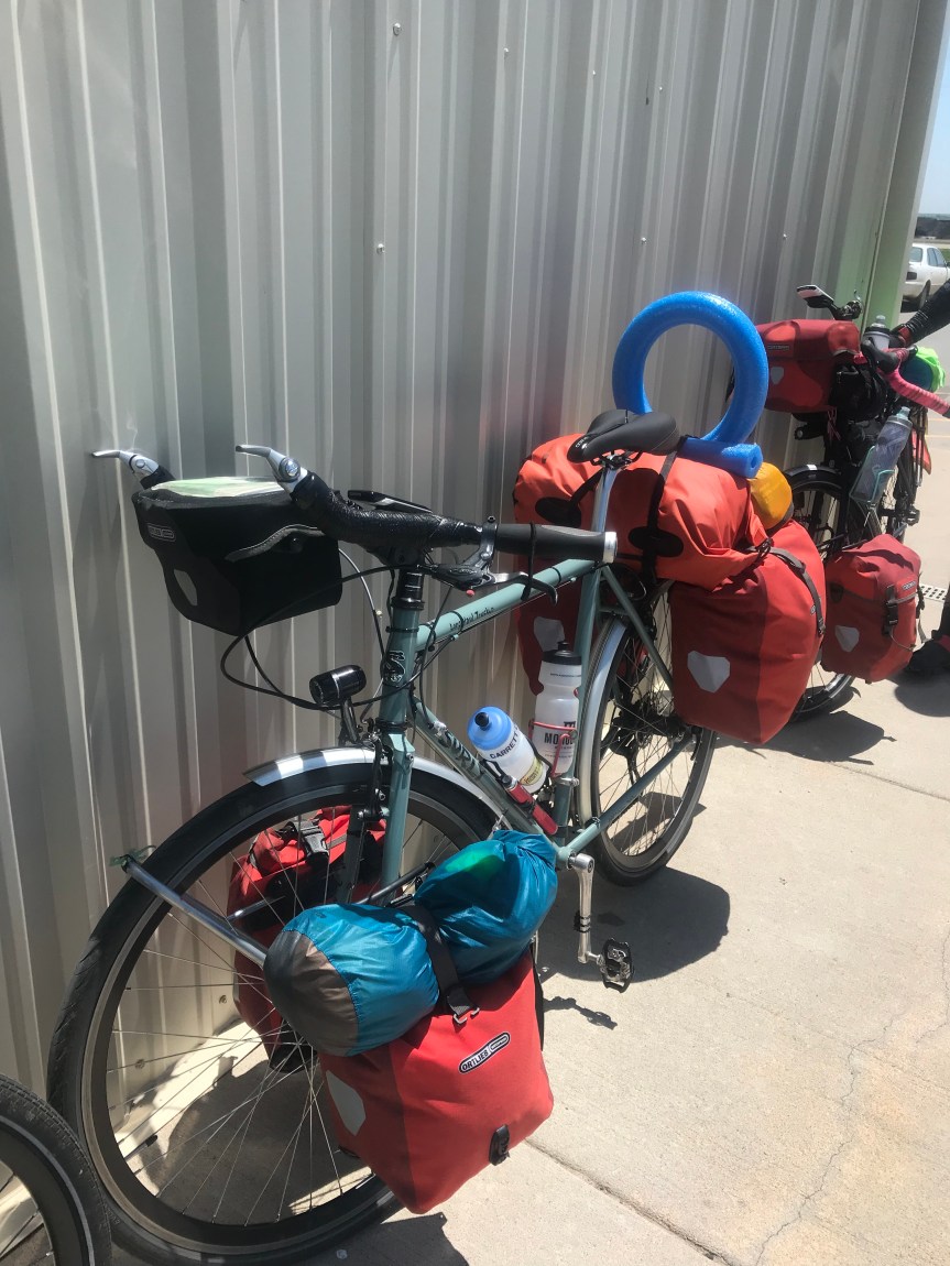 33 miles later we rode into Ness City like cowpokes after a cattle drive. Alas there was no saloon with sportin’ women. We settled for a quick break at Dollar General where Mark bought a pool noodle. It made me think of Dave.
