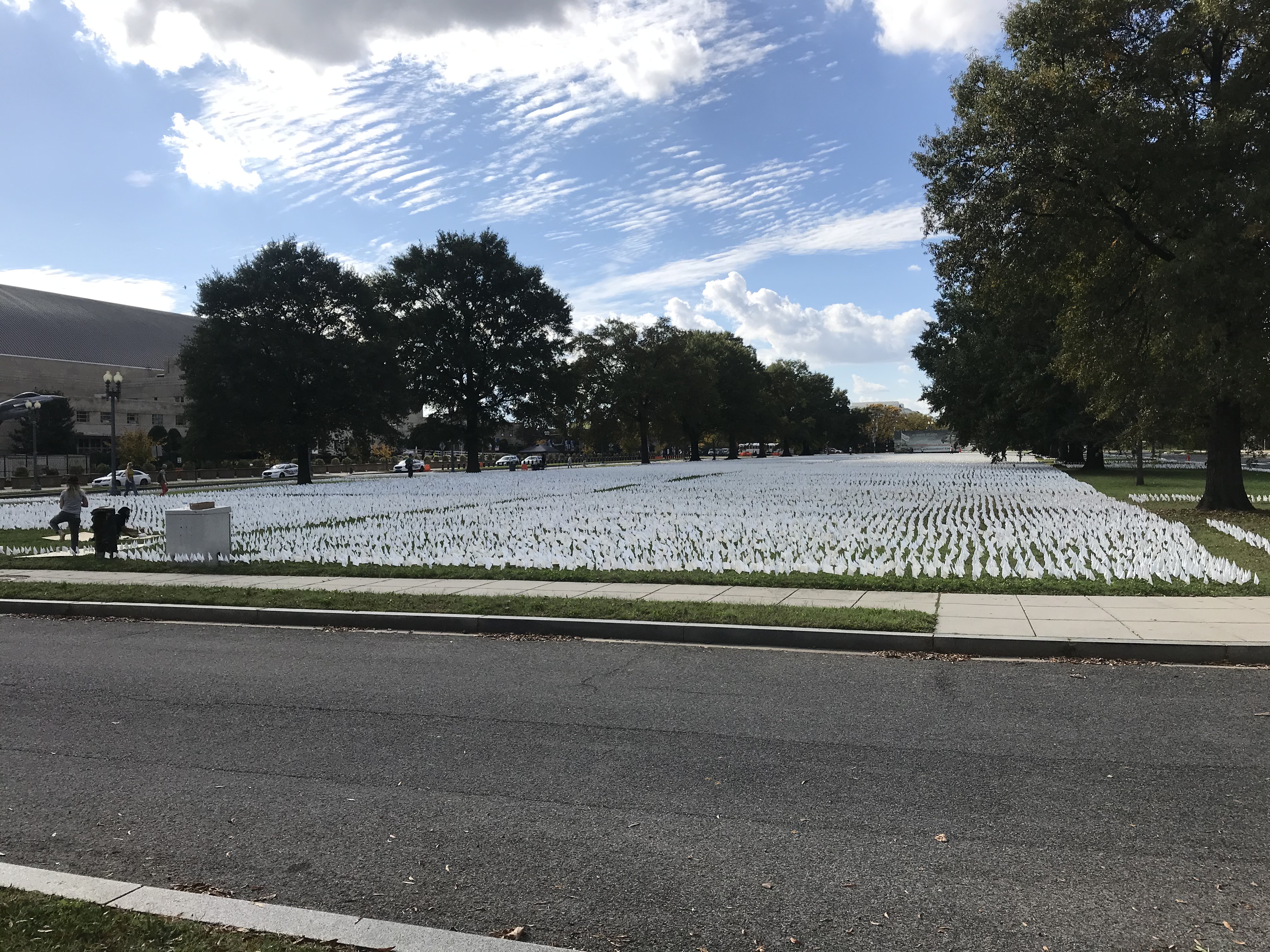 The orderly flags remind me of the white headstones in military cemeteries like Arlington and Colleville-sur-Mer. So clean. So white. So much death. How could this happen in America?
