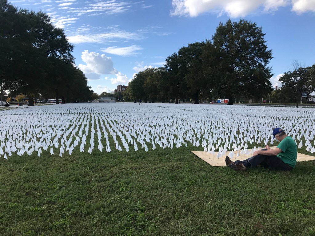 Volunteers are welcome to come and install flags. Sadly, there will be about 1,000 new flags every day for the duration of the display. Wear a mask and observe social distancing, of course. Or just come and bear witness.