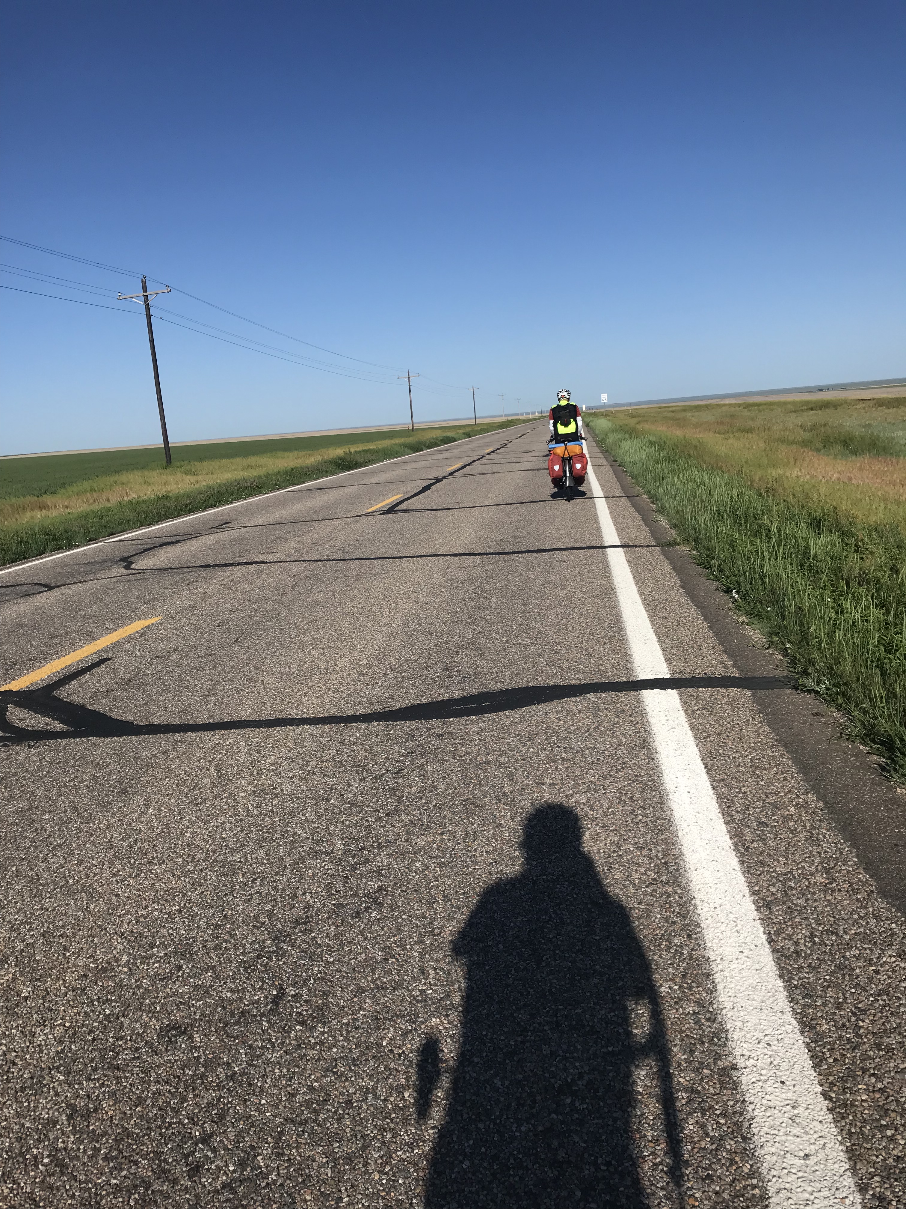 The remaining 20 miles were a grind. The terrain however was gently downhill and, with the aid of a mild tailwind, I took full advantage. My speedometer read between 15 and 18 mph the whole way. The five miles after Sugar City were flat. Not one inch up or down.