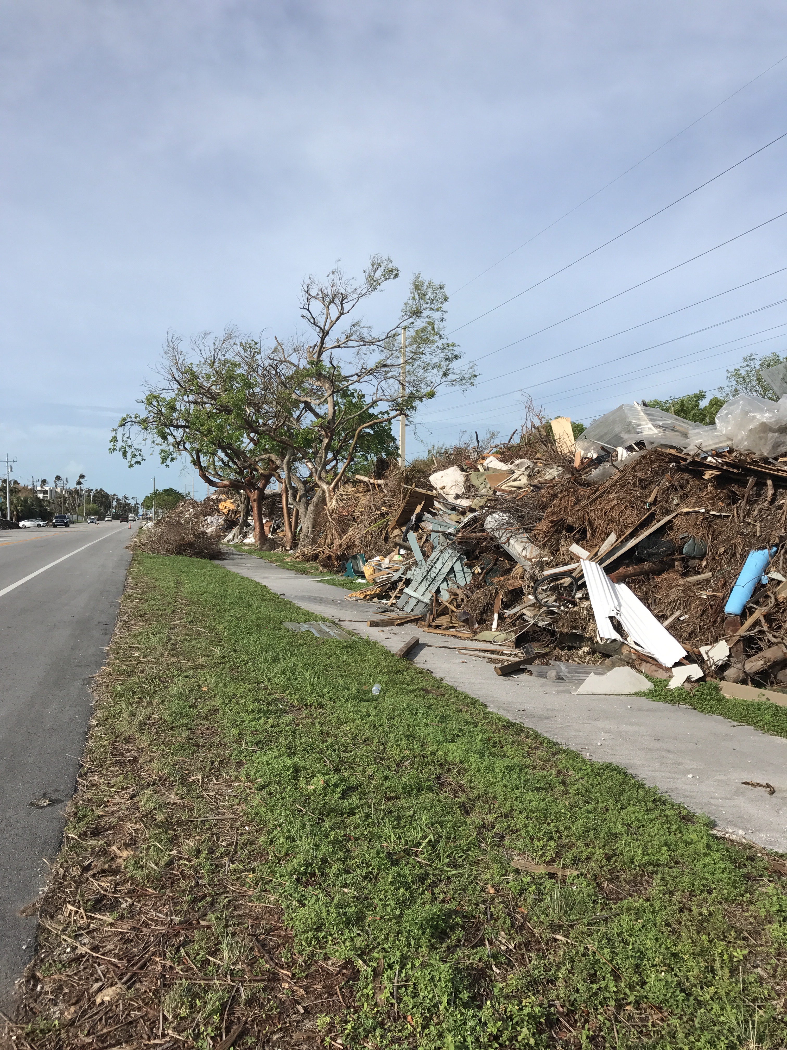 The middle Keys got hit hardest and it showed. Debris was strewn among the mangroves along the east side of the road. Roadside piles were bigger and bigger. At a state park a consolidation area was set up. Plant based debris was being ground up into a mulch. Lord knows what will be done with the appliances, furniture, and house parts I saw. South of marathon the mother of all debris piles stretched on and on. Mount Irma. It’s hard to believe a month has passed. I can only imagine what Puerto Rico is dealing with.