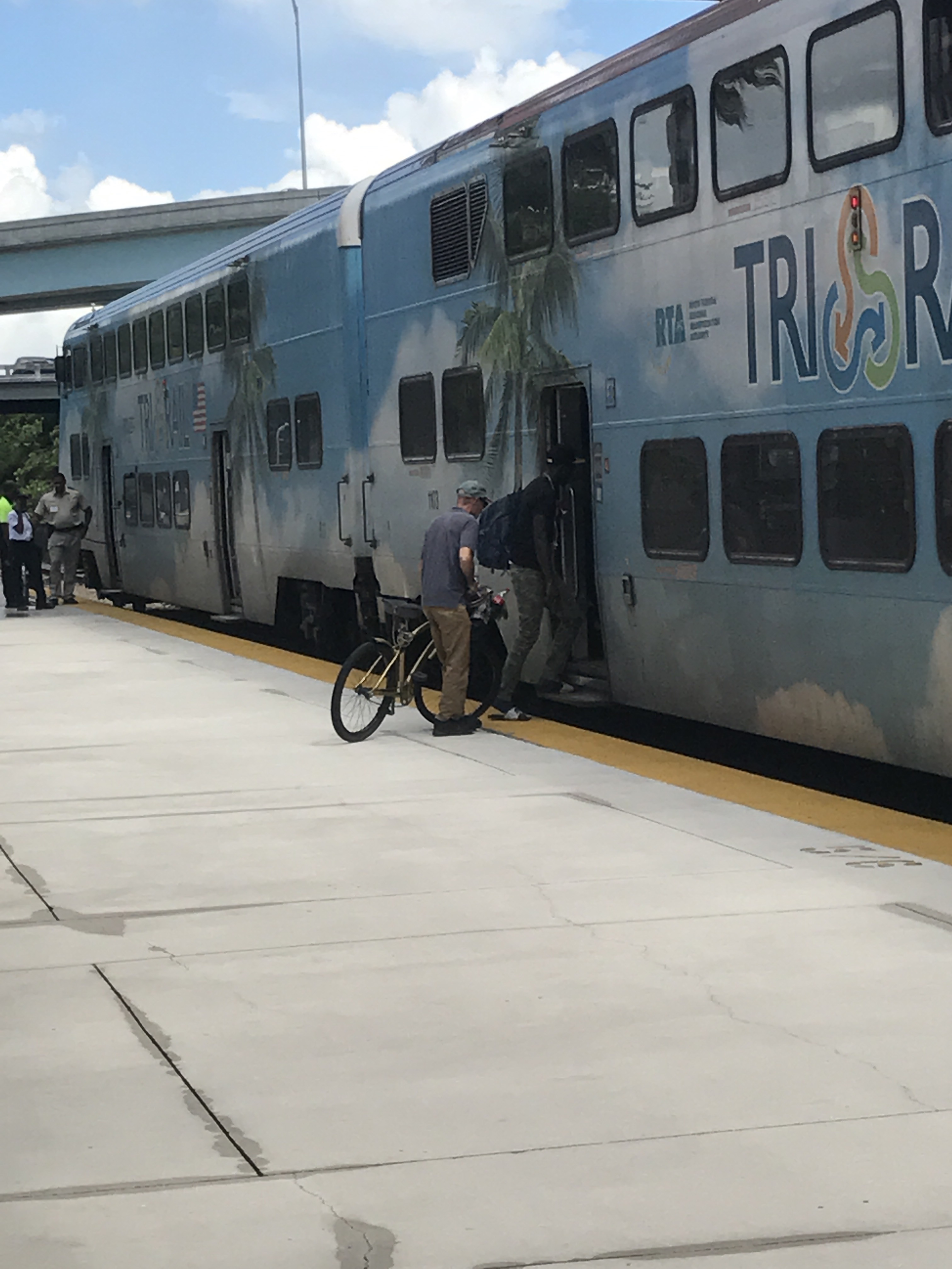 The local intrastate trains have roll on bike cars. Like in Stockholm and Sydney. Florida, there’s hope for you yet.
