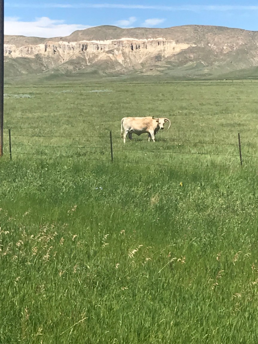At the bottom was a vast valley with Square Butte on my left and Antelope Butte on my right. The cave-like holes in the face of the butte caught my eye as did the defective longhorn steer in the field between the butte and me.