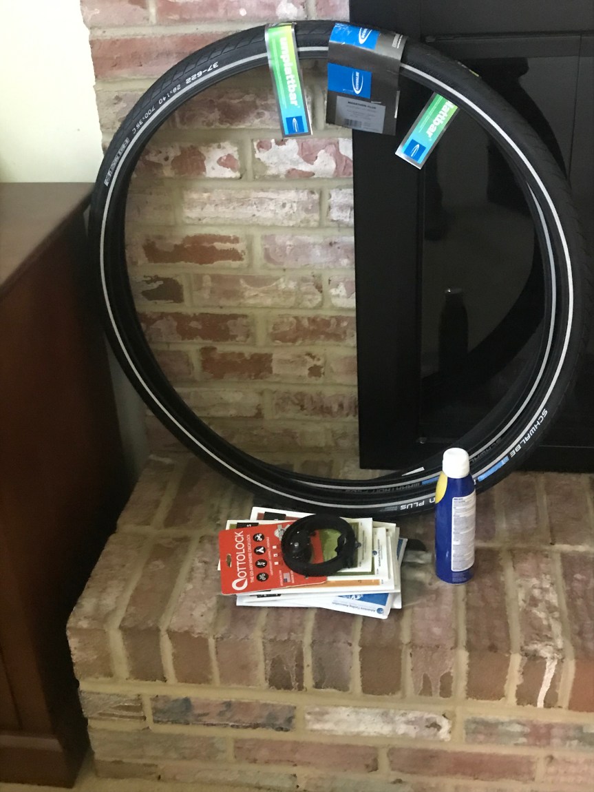 I’m starting to amass some new stuff for my bike trip. Two new Schwalbe Marathon Plus tires to replace the two I’ve been riding for a year and nearly 5,000 miles. (The old ones are still usable but won’t survive a long tour.)