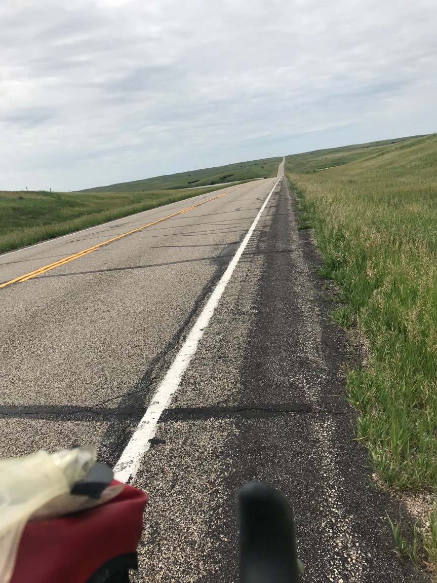 The route goes on I-94 but most people take a dirt road instead. The shoulders on I-94 are 10 feet wide and paved. Some genius at the North Dakota DOT put rumble strips across all ten feet. If you rode the entire 10 miles of the route on this, you could forget about having usable personal parts for a year or two.