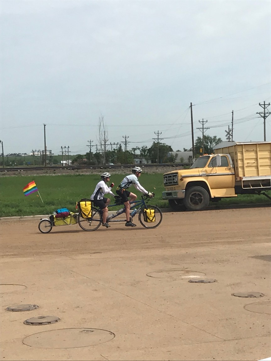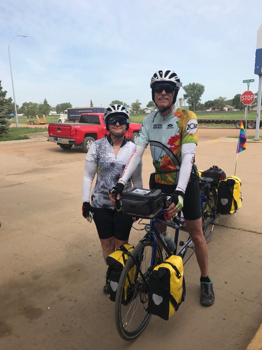 Once back on pavement I rode into Glen Ullin where I snacked in the shade of a gas station convenience store. Up pulled an eastbound tandem pulling a trailer. Gail and Bill Buckley were riding to somewhere on the New Jersey shore.