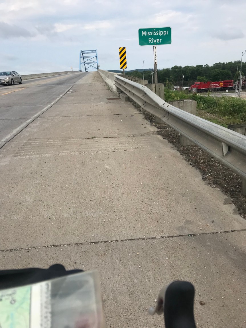 A few miles later I flew down a curving hill to the Mississippi River. It was a thrilling ride. I just took the lane and went for it.