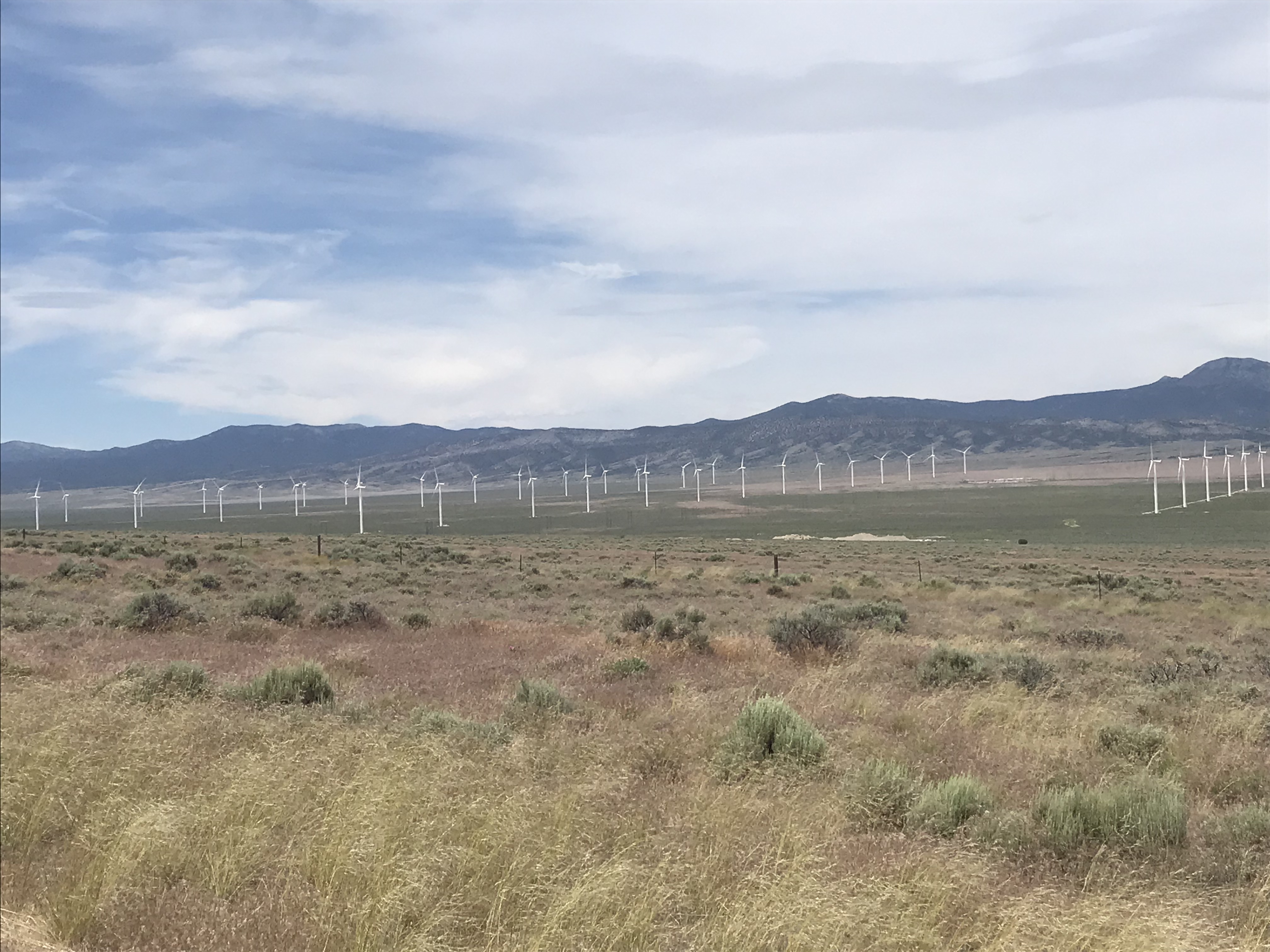 That beneficial tailwind was now in my face and it was strong. (Should’ve hit the road earlier!) even with the remains of the downhill I had to work my butt off to make forward progress. In the valley there were lines of wind turbines spinning away.