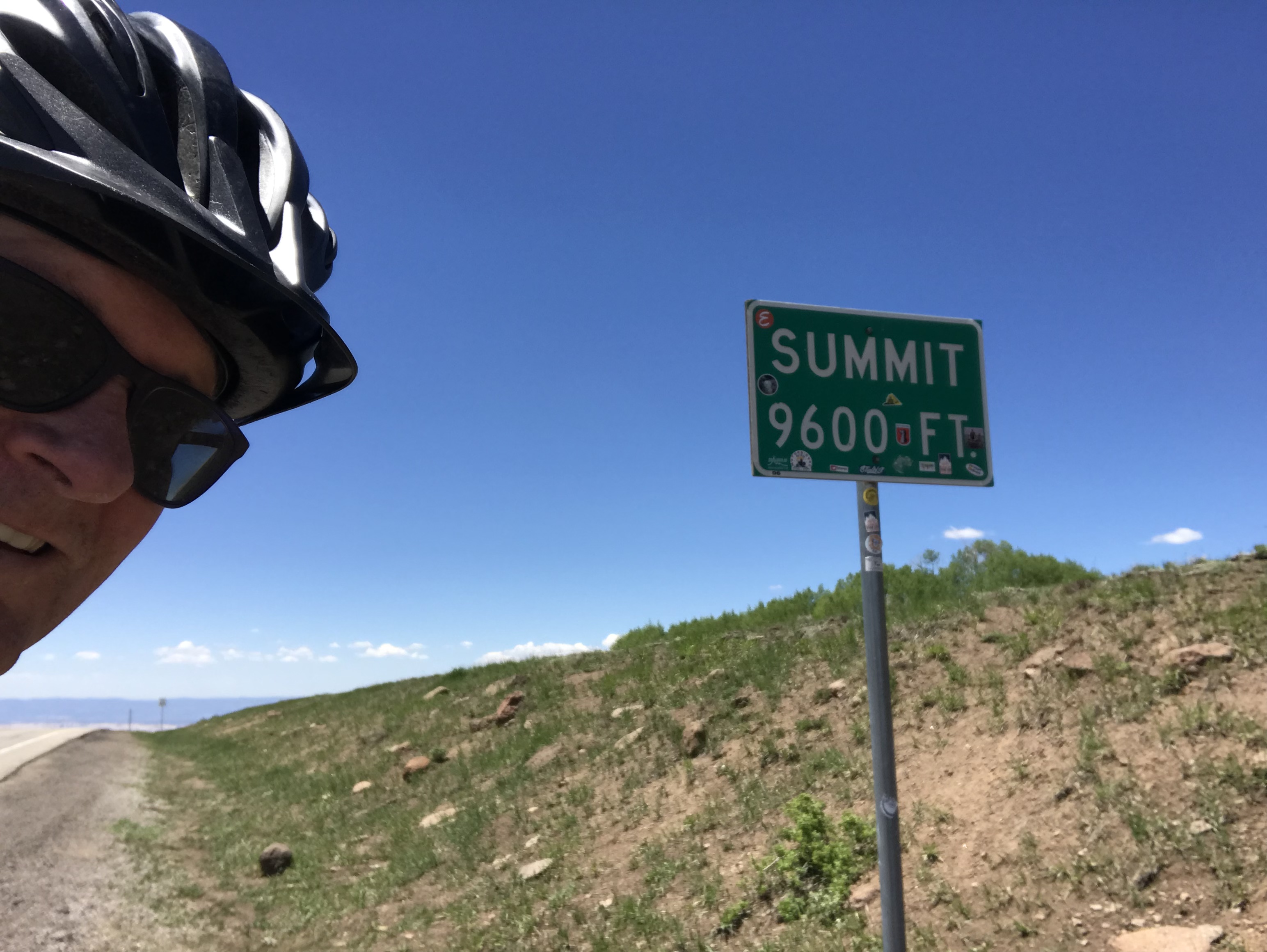 I kept grinding away thinking that the 10,300 foot summit was many miles away. I got off my bike and looked at the compass and elevation app on my phone. It said I was at 9,600 feet. Then I jiggled my phone and the app recalculated. 10,000 feet. Could it be?
