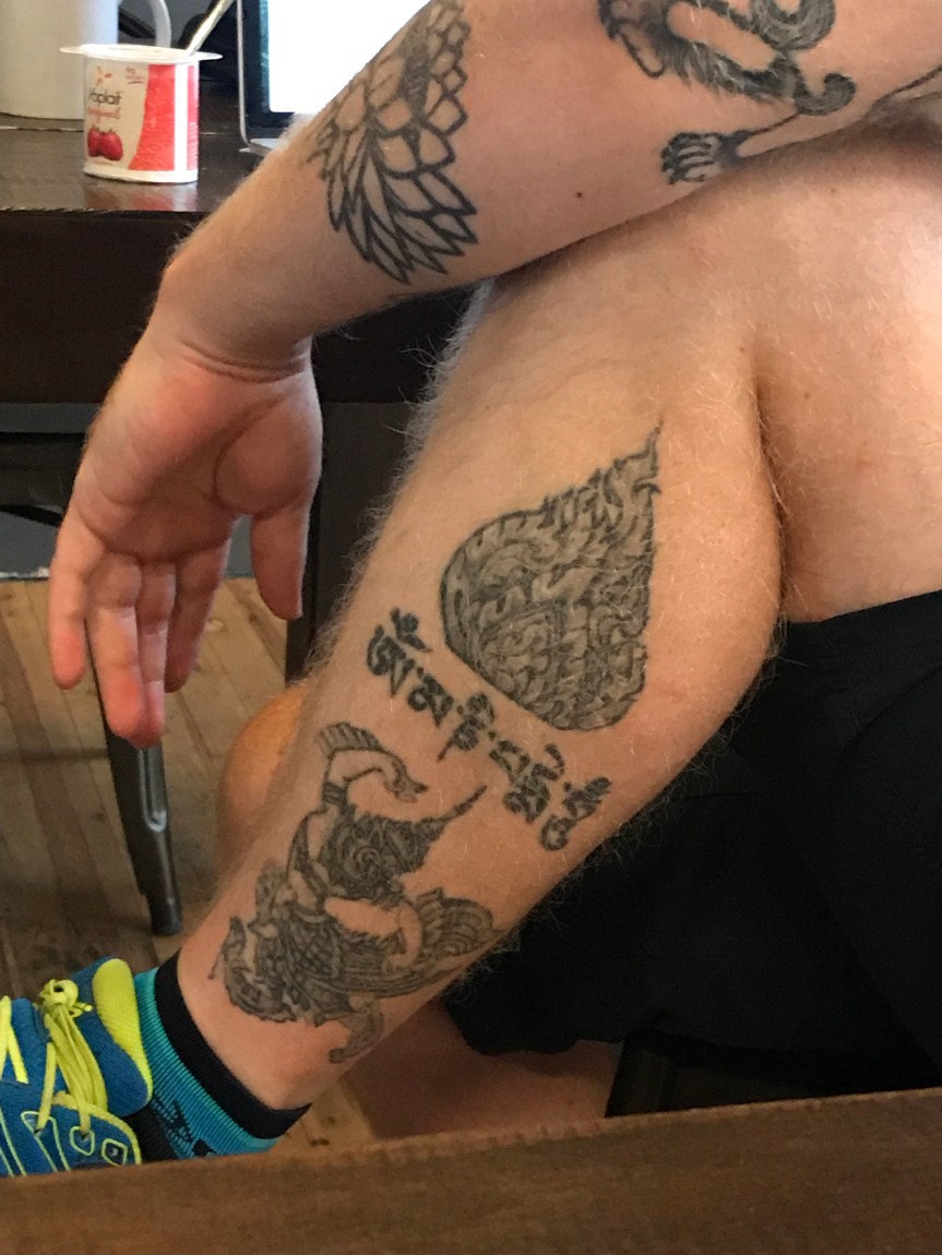 Nick and a cool Bhuddist tattoo on his calf.